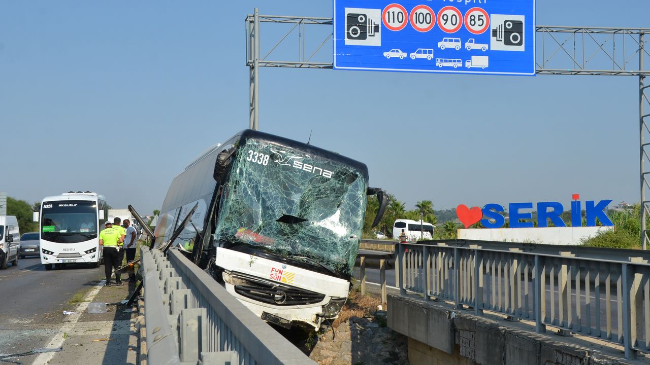 Kaza, sabah saatlerinde Antalya- Alanya D400 kara yolu Aspendos Köprüsü'nde meydana geldi. Antalya Havalimanı'ndan aldığı 34 turisti 10 ARR 495 plakalı tur otobüsüyle Manavgat ve Alanya ilçelerindeki otellerine taşıyan Şeref D., direksiyon kontrolünü yitirdi. Yoldan çıkıp refüjdeki demir bariyerleri parçalayan otobüs, yaklaşık 100 metre ilerledi. Duble yol üzerinde kurulu, altından Köprüçay Irmağı akan köprünün korkuluklarına çarpan otobüs, yaklaşık 30 metre yükseklikten düşmeye ramak kala durdu. Otobüsteki sürücü, rehber ve turistler kazayı yara almadan atlattı. Çevredekilerin ihbarı üzerine kaza yerine çok sayıda ekip sevk edildi. Otobüstekiler kendi imkanlarıyla dışarı çıktı. Firmaya ait başka bir araca alınan turistler yola devam etti. Kazaya ilişkin inceleme başlatıldı.