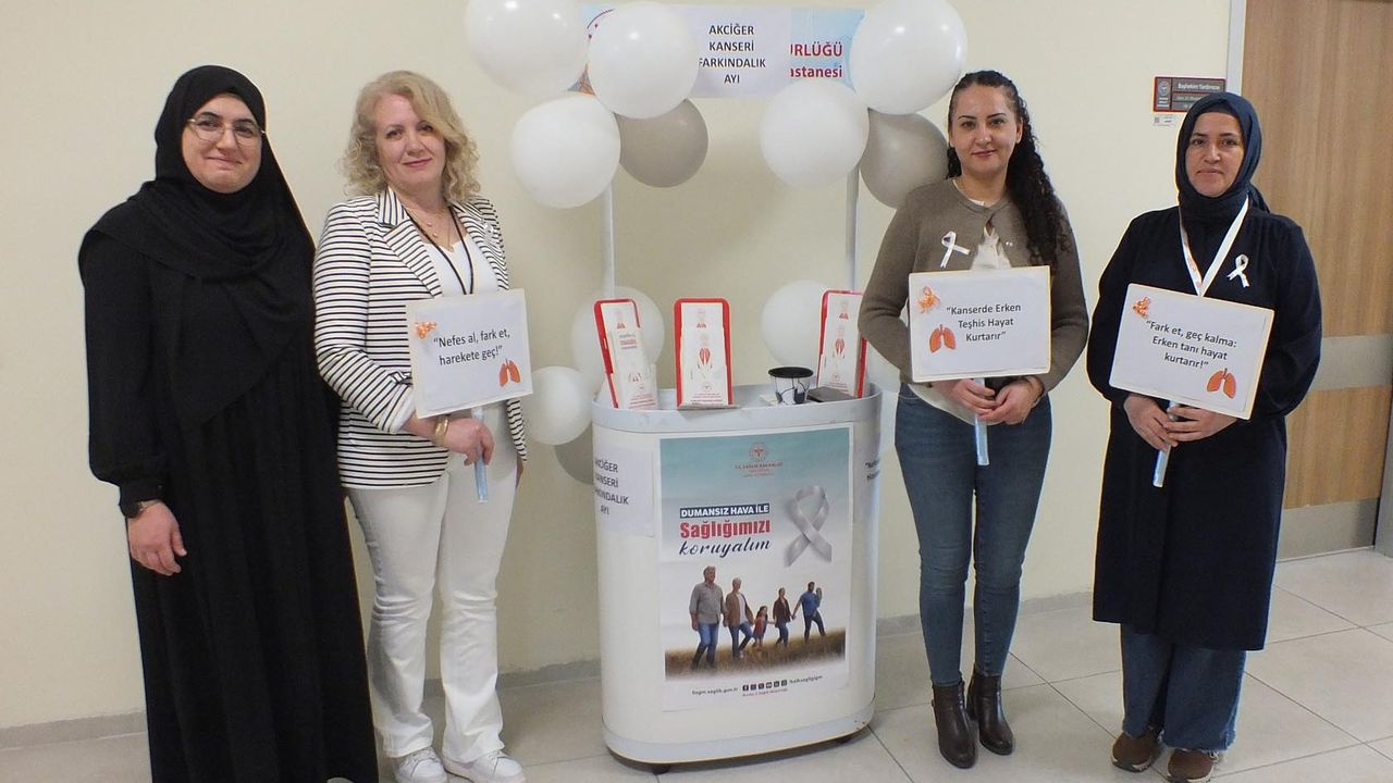 Devlet Hastanesi'nde Akciğer Kanseri Farkındalık Ayı kapsamında toplumda erken tanı bilincini artırmak ve sigara kullanımının yol açtığı sağlık risklerine dikkati çekmek amacıyla bilgilendirme standı kuruldu.