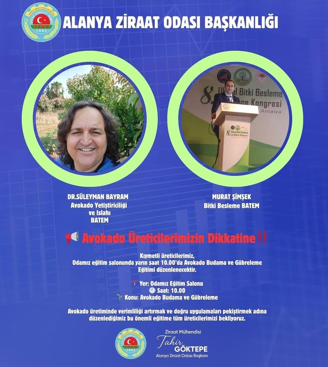 Alanya’da avokado üreticilerine yönelik bilgilendirme eğitimi yarın saat 10.00’da Oda Eğitim Salonu’nda yapılacak. Eğitimde Batı Akdeniz Tarımsal Araştırma Enstitüsü’nden (BATEM) Dr. Süleyman Bayram avokado yetiştiriciliği ve ıslahı konusunda, Murat Şimşek ise bitki besleme alanında sunum gerçekleştirecek.