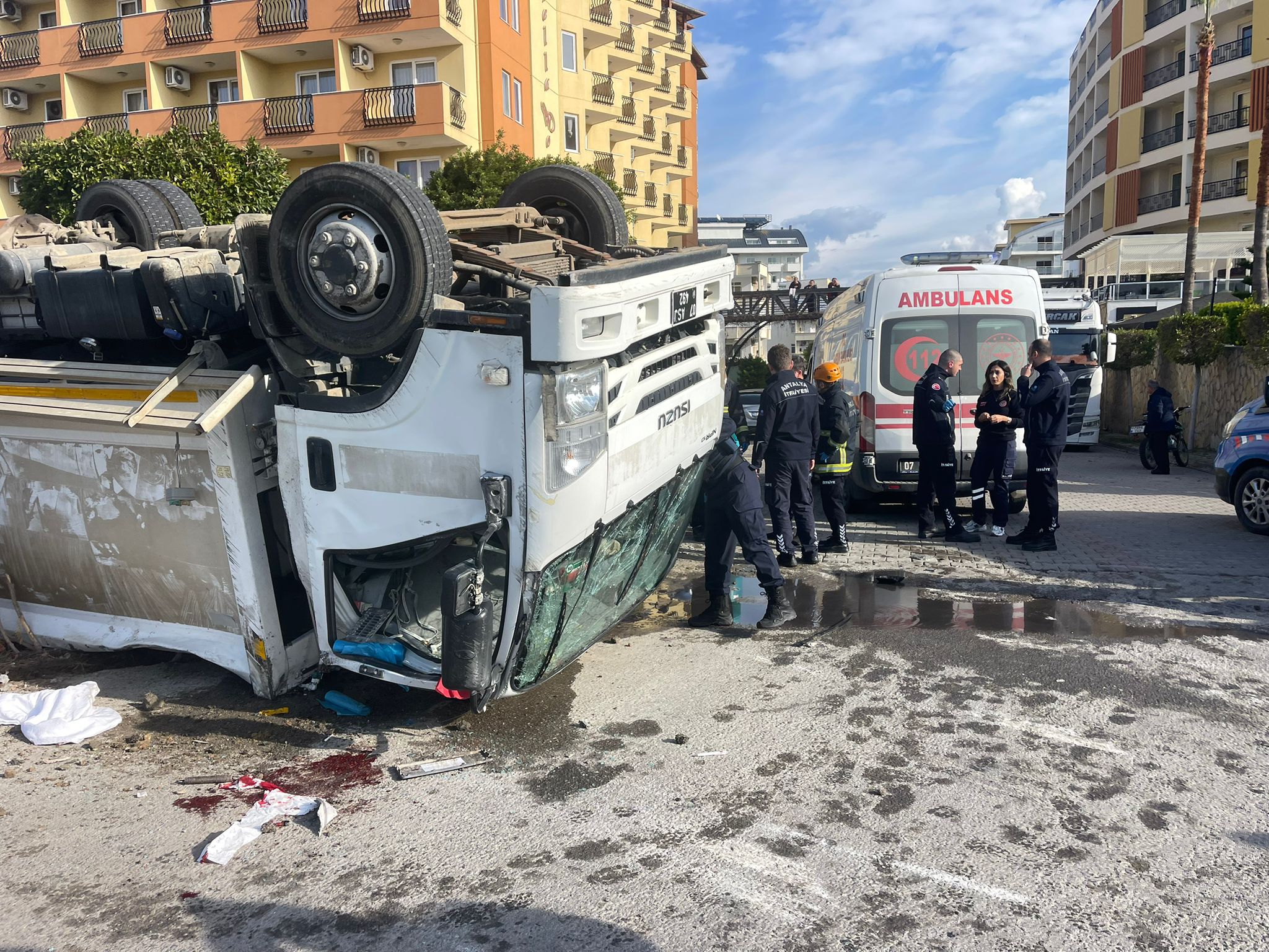 Olay, Alanya Avsallar Mahallesi'nde saat 10.30 sıralarında, Alanya D-400 kara yolunda meydana geldi. G.D.'nin kullandığı 09 AIC 924 plakalı kamyonla Alanya Belediyesi'ne ait H.Ö.'nün kullandığı 07 ASJ 492 plakalı çöp kamyonu çarpıştı. Devrilen çöp kamyonu, sürüklenerek park halindeki 07 AUN 880 plakalı elektrikli motosikleti devirip alt geçit demirine çarparak durdu. İhbar üzerine bölgeye itfaiye, sağlık, jandarma ve polis ekipleri sevk edildi. Yaralanan çöp kamyonu sürücüsü H.Ö. ile belediye personeli M.G. ve H.Ü., sağlık ekipleri tarafından hastaneye kaldırıldı. Sürücü H.Ö.’nün hayati tehlikesinin bulunduğu öğrenildi.
