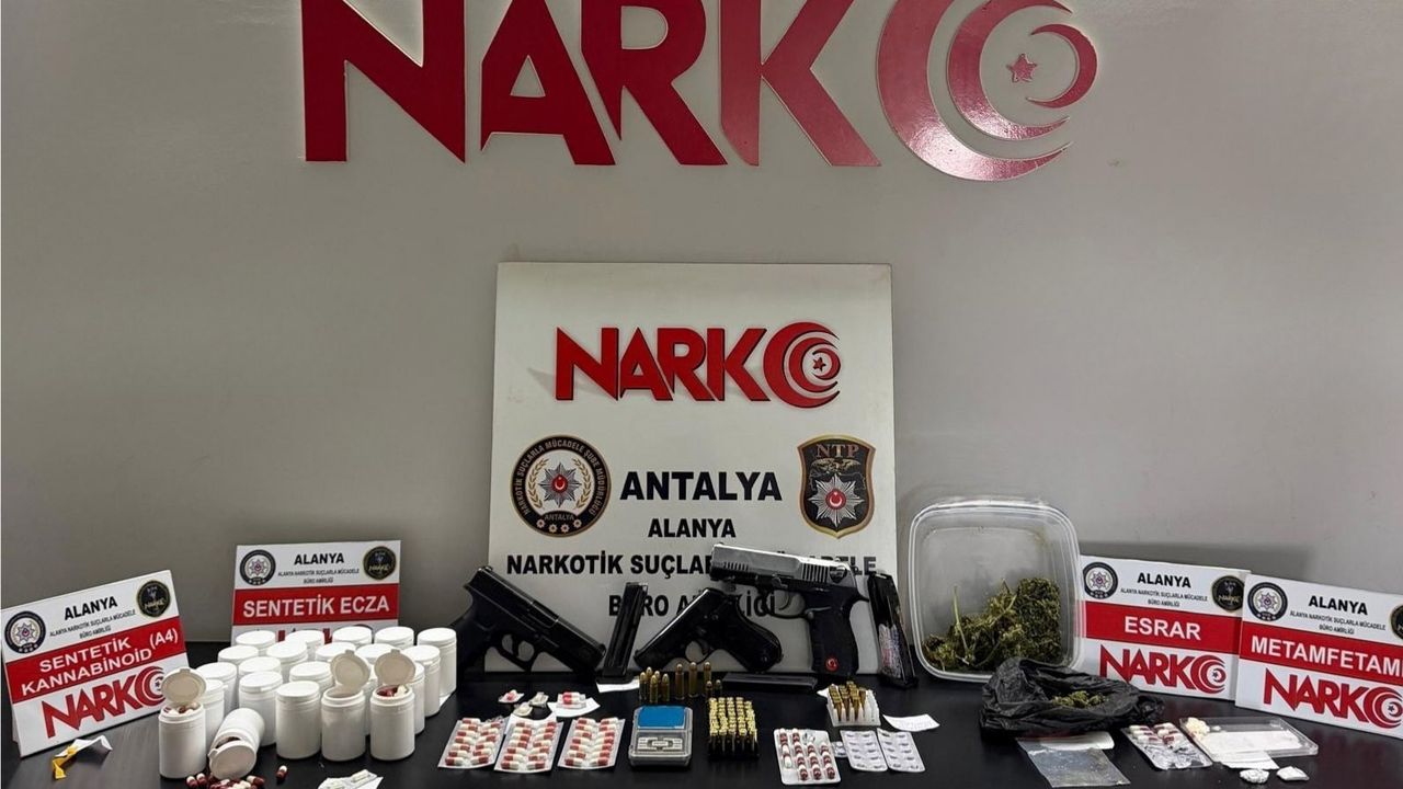 Alanya Emniyet Müdürlüğü Narkotik Suçlarla Mücadele Şube Müdürlüğü ekipleri, ilçede tespit edilen 45 adrese 50 ekip, 190 personel ve 2 narkotik madde arama köpeğiyle baskın yaptı. Operasyon kapsamında toplam 22 bin 240 kullanımlık sentetik kannabinoid (A4), 1 bin 278 adet sentetik ecza maddesi, 38 gram esrar, 1 gram metamfetamin, 3 tabanca, 3 şarjör, 69 fişek ve 1 hassas terazi ele geçirildi. Ayrıca 2 aranan şahıs yakalandı.“Uyuşturucu veya Uyarıcı Madde Ticareti Yapmak ve Sağlamak” suçundan 37 şüpheli hakkında adli işlem başlatıldı. Şüphelilerin emniyetteki işlemleri devam ediyor.