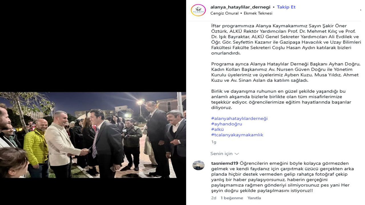 Ancak iddialara göre, iftar organizasyonuyla hiçbir ilgisi olmayan ve davet edilmeyen Ayhan Doğru, Kaymakam Öztürk’ün programa katılacağını öğrenince etkinliğe giderek sadece kendisiyle birkaç fotoğraf çektirdi. Ardından derneğin ve kendi sosyal medya hesaplarında bu fotoğrafları paylaşarak, sanki iftar programını Alanya Hataylılar Derneği’nin düzenlediği izlenimi yarattı.