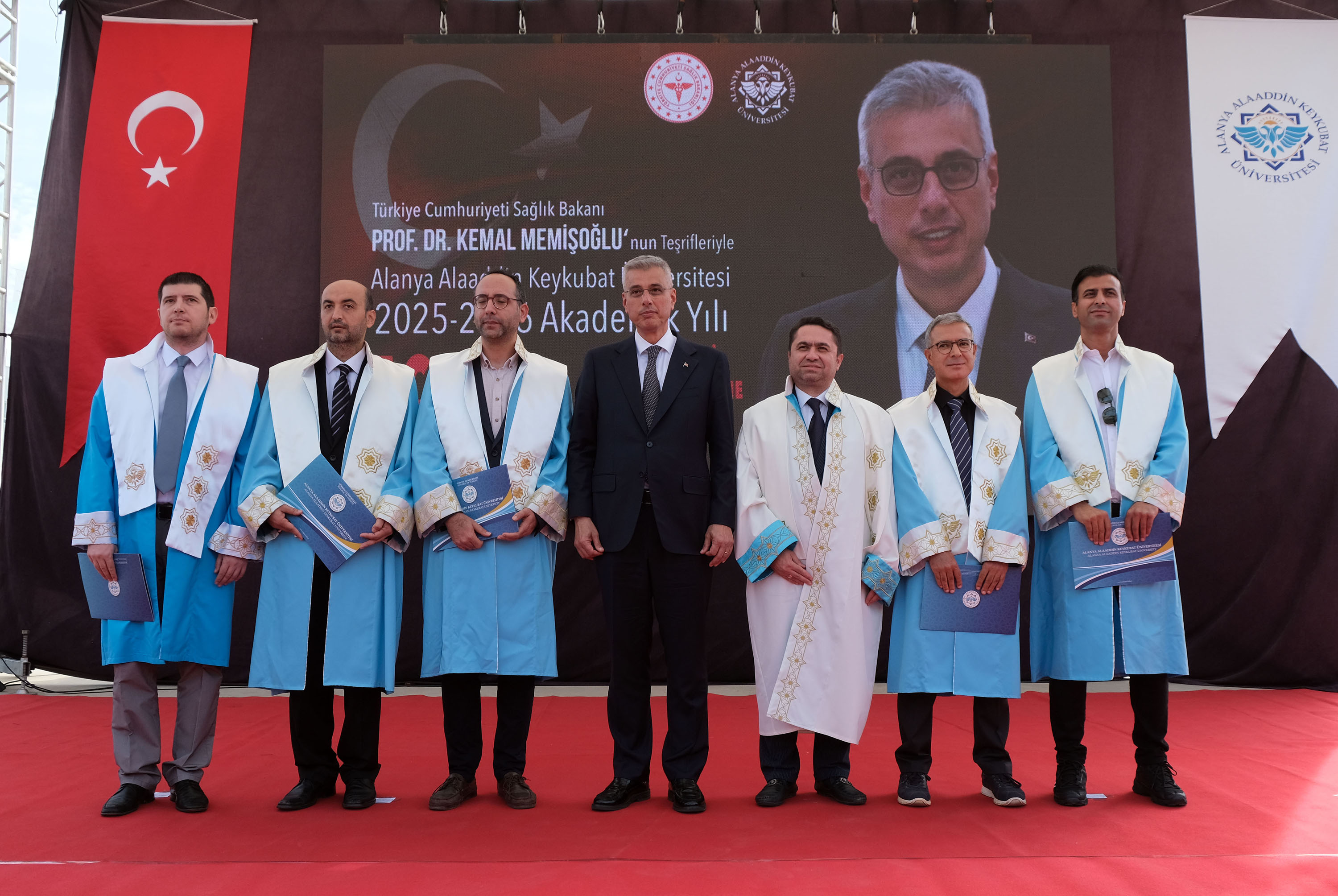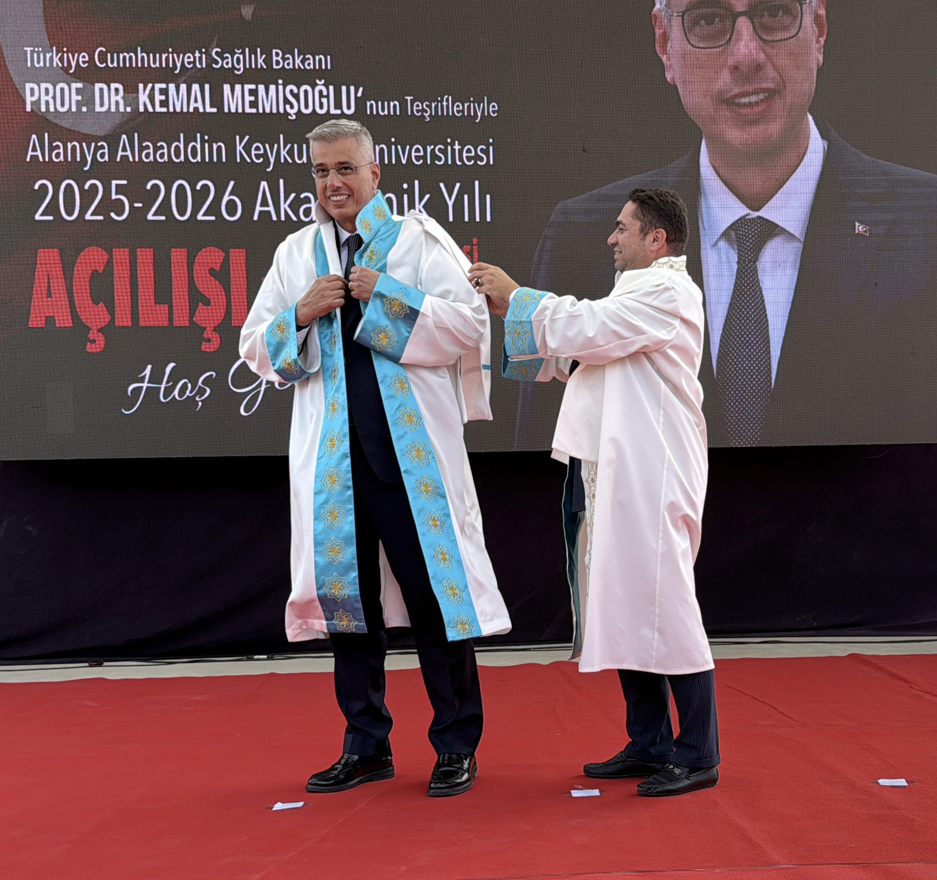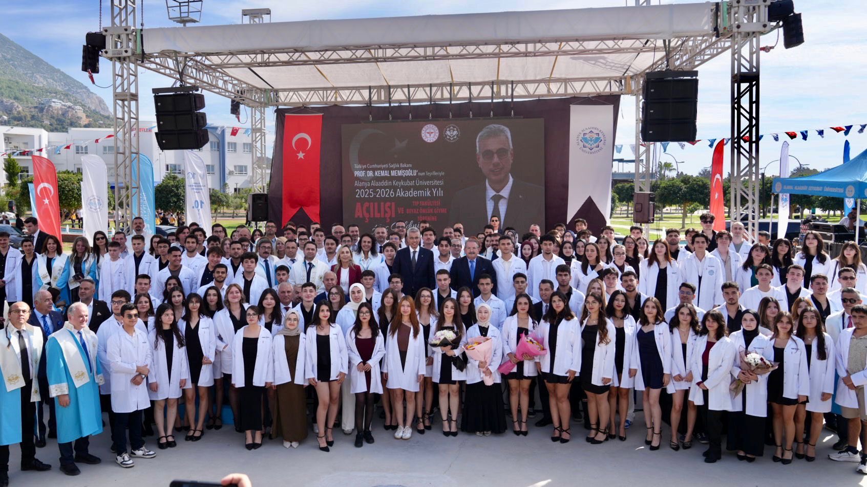 Sağlık Bakanı Memişoğlu, Antalya’nın Alanya ilçesinde, 'Alanya Alaaddin Keykubat Üniversitesi’nin (ALKÜ) 2025-2026 Akademik Yılı Açılış ve Tıp Fakültesi Beyaz Önlük Giyme Töreni'ne katıldı. Kestel Amfitiyatro'da düzenlenen tören, ALKÜ'nün 10'uncu yıl tanıtım filmiyle başladı. Törende Sağlık Bakanı Kemal Memişoğlu, öğrencilere, akademisyenlere ve öğrenci ailelerine seslendi. Sözlerine ailelere teşekkür ederek başlayan Bakan Memişoğlu, "Bilim yuvasında eğitim alıp, Türkiye'nin geleceğine katkı verecek çocuklar yetiştirdikleri için minnetlerimi sunuyorum. Özellikle annelere teşekkür ediyorum. Bu evlatları, milletin en iyi okullarında okutmak için gecesini gündüzüne katan tüm ailelerimize, bu ülke adına şükranlarımı sunuyorum" dedi.