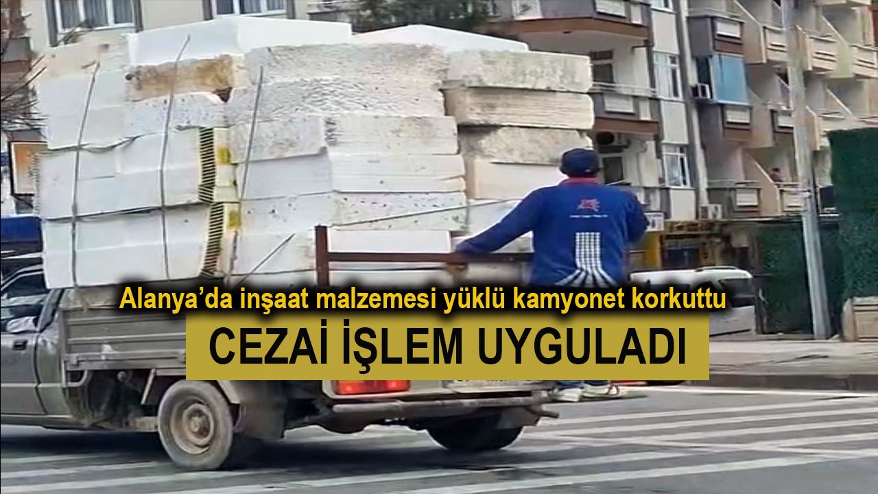 Alanya'da inşaat malzemesi yüklü kamyonetin kasasından tutunarak yolculuk yapan kişi, diğer sürücüler tarafından cep telefonuyla kaydedildi. Görüntülerin sanal medyada paylaşılması üzerine araç plakasına 3 bin lira cezai işlem uyguladı.