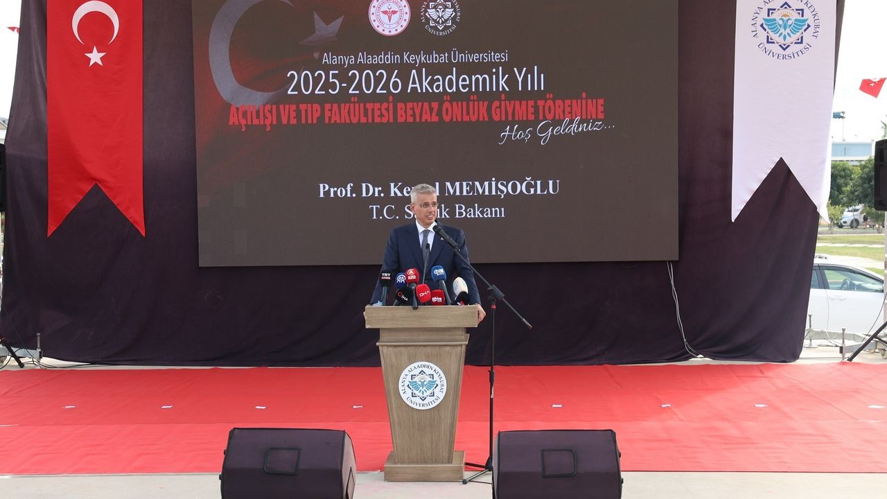 Sağlık Bakanı Kemal Memişoğlu, konuşmasında tıp fakültesi öğrencilerine ilk ders vererek başladı. Bakan Memişoğlu ilk ders konuşmasında yeni dönemim öğrencilere ve ülkemize hayırlı olmasını diledi. Bakan Memişoğlu konuşmasının devamında, “ALKÜ kampüsü çok güzel bir kampüs, yapanlardan emeğe geçenlerden başta Cumhurbaşkanımız Sayın Recep Tayyip Erdoğan ve önceki dönem Dışişleri Bakanımız Antalya Milletvekili Sayın Mevlüt Çavuşoğlu olmak üzere şimdiye kadar oluşmasında, gelişmesinde bütün katkı veren herkese teşekkür ediyorum. Burası bir bilim yuvası. Burası bir geleceğin inşasını yapan üniversite. Onun için burada olmak ve böyle bir açılışta bize de imkân vermek ve bu imkânda size söylemlerde bulunmak bizim için gurur. Ailelerimize gerçekten böyle bilim yuvasında eğitim alıp Türkiye'nin geleceğine katkı verecek çocukları yetiştirdikleri için teşekkürlerimi sunuyorum. Akademisyenlerimiz gerçekten bu ülkenin geleceğini inşa ediyorlar. Onlara minnetlerimi arz ediyorum. Gençler beyaz önlüğü vicdanı olarak özellikle hekimlik, kendi hayatlarını başkalarına feda eden, kendi çocuğu hastalandığı zaman onu bırakıp da başkasının çocuğuna şifa ve derman bulmak için koşan esasında adanmışlık bir meslektir. Gençler gelecek sizindir. Bizler tecrübelerimizi, bilgilerimizi sizlere aktaracağız. Sizler iyiliğin temsilcilisiniz. Onun için daha çok çalışacağız, daha çok üreteceğiz. Gençler, 21 yaşında fethedilemeyecek bir medeniyeti fethetmiş ve Fatih ismini almış bir gencin temsilcilerisiniz. Sizler 38 yaşındaki küçücük bir gemiyle Samsun'a çıkıp yok olmakta olan vatanı kurtaran atalarınızın temsilcilerisiniz. Bunu hiç unutmayın. Bizler sizlerin önünü açmak için buna çabalıyoruz. Sağlıkta son 25 yılda Cumhurbaşkanımızın liderliğinde çok şey yaptık, çok şey ürettik. Daha da çok üreteceğiz. Ülkemizin dünyanın en iyi sağlık hizmeti sunan ülkesi değil dünyaya yeni şeyler söyleyebilen bir ülke olması için ulaşıyoruz. Sizlere bu çıktığınız yolda başarılar diliyorum. Beyaz önlük, adanmışlığın işaretidir. Sizler kendiniz için değil, insanlık için yaşamaya başladığınız andır. O önlüğü giydiğiniz anda o değerinizi insanlık için harcamaya, vermeye hazır olan insanlarsınız. Üniversitemiz bu konuda Türkiye'ye örnek olan bir üniversitedir. Sayın Rektörümüz Prof. Dr. Kenan Ahmet Türkdoğan ile yıllarca mesai harcadık beraber çalıştık. İdealini bilirim. Onun için burada olmaktan çok onur duydum. Sizlerle birlikte olmaktan mutluluk duydum. Allah hepinizin yolunu açık etsin. 2025-2026 Öğretim Eğitim Yılı hepinize hayırlı olmasını diliyorum.” dedi.