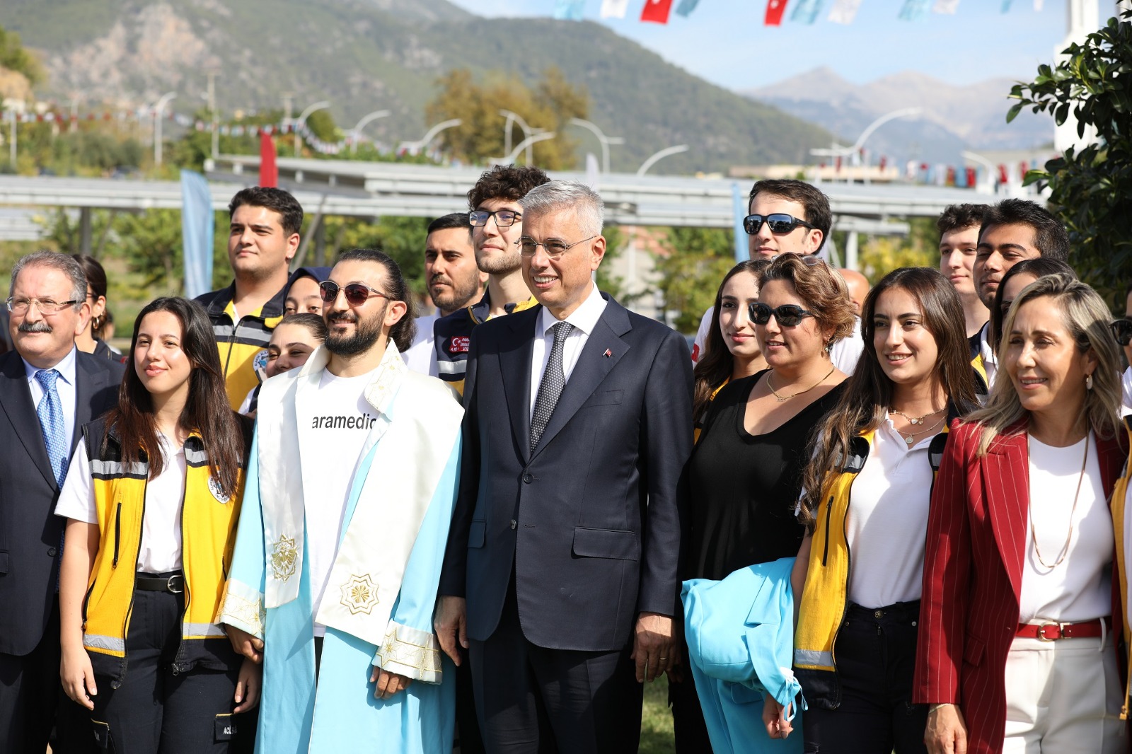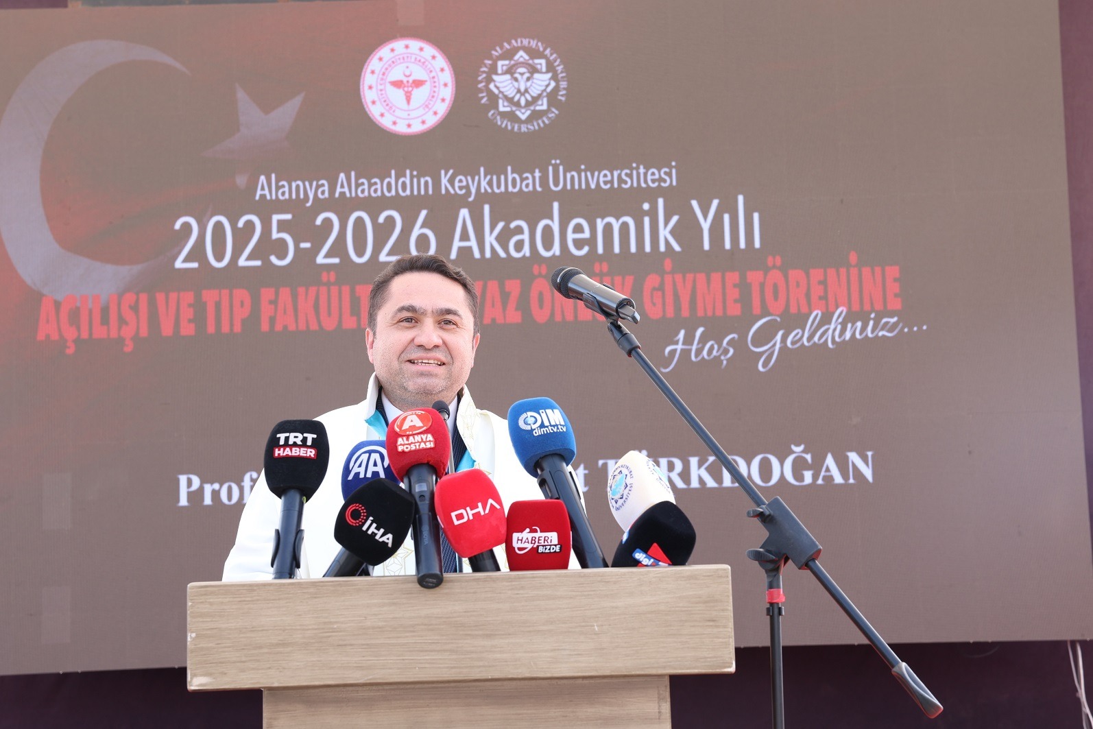 Alanya’nın bilimsel gelişmeler sayesinde sadece turizmin değil aynı zamanda bilimin merkezi olduğunun altını çizen Rektör Türkdoğan, “Yarın daha güçlü bir sağlık kampüsü, daha ileri teknoloji merkezleri ve daha geniş bir üniversite vizyonu ile yolumuza devam edeceğiz. Bu süreçte özellikle sağlık alanındaki büyümemizde; katkıları, destekleri ve varlığıyla bizlere her daim destek ve güç veren Sayın Sağlık Bakanımıza üniversitemiz adına teşekkürlerimi sunuyorum. Hep birlikte; araştıran, üreten ve dünyaya katkı sunan bir üniversite olma yolunda kararlılıkla yürüyeceğiz. Sevgili Öğrencilerimiz, Sizler bu üniversitenin, bu şehrin ve bu ülkenin geleceğisiniz. Unutmayın! Bilim cesaret, sabır, inanç ister. Biz size inanıyoruz. Bu dönemde gençliğe, eğitime ve sağlığa verilen önem ve yatırımlar asla göz ardı edilemez. Sayın Cumhurbaşkanımıza şükranlarımı arz ederim. Yeni akademik yılın üniversitemize, şehrimize ve ülkemize bilim, başarı, bereket ve hayırlar getirmesini diliyor; başarılarımızın mimarı tüm akademisyenlerimize, idari personelimize ve öğrencilerimiz nezdinde tüm ailelere teşekkür ediyorum.” dedi.