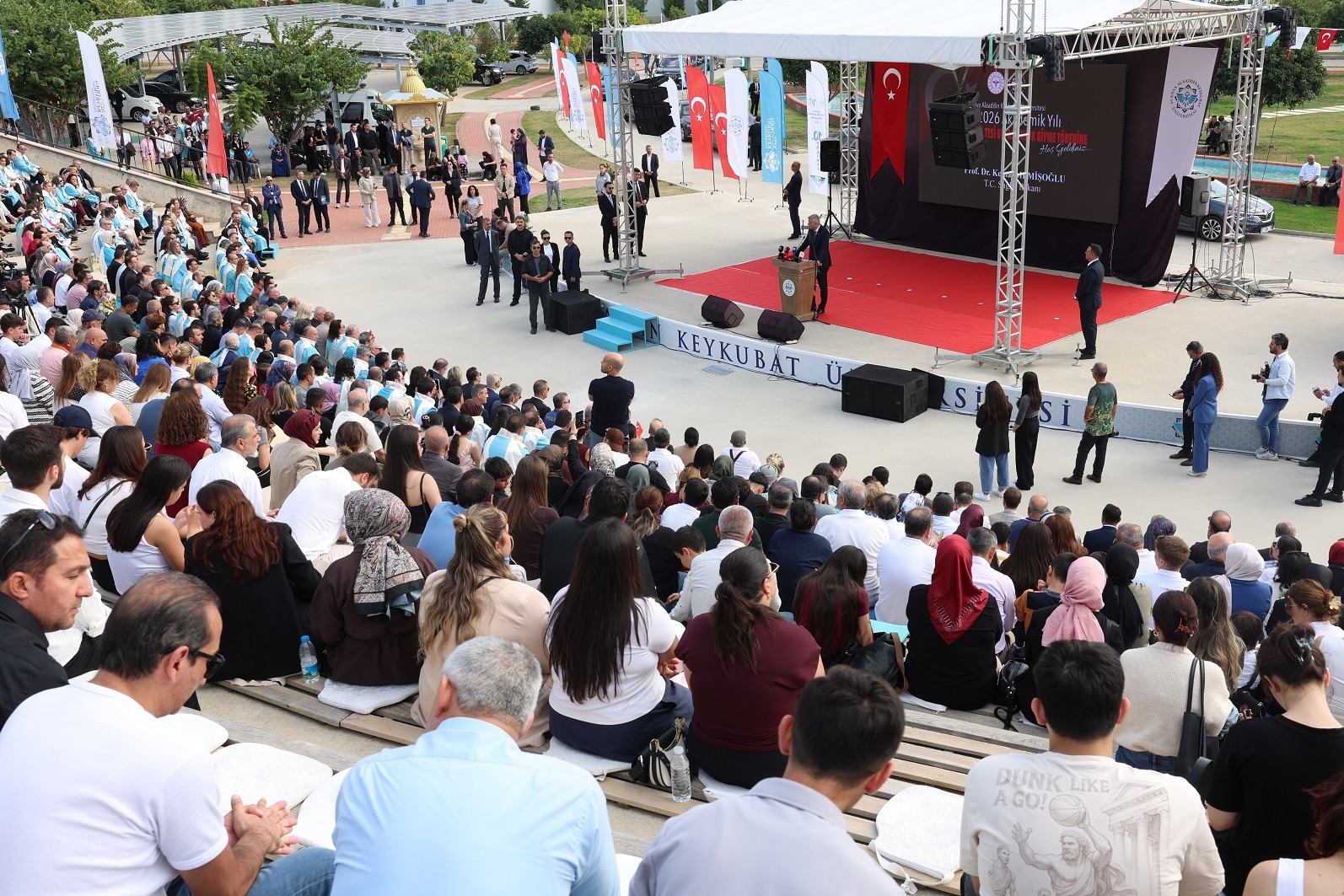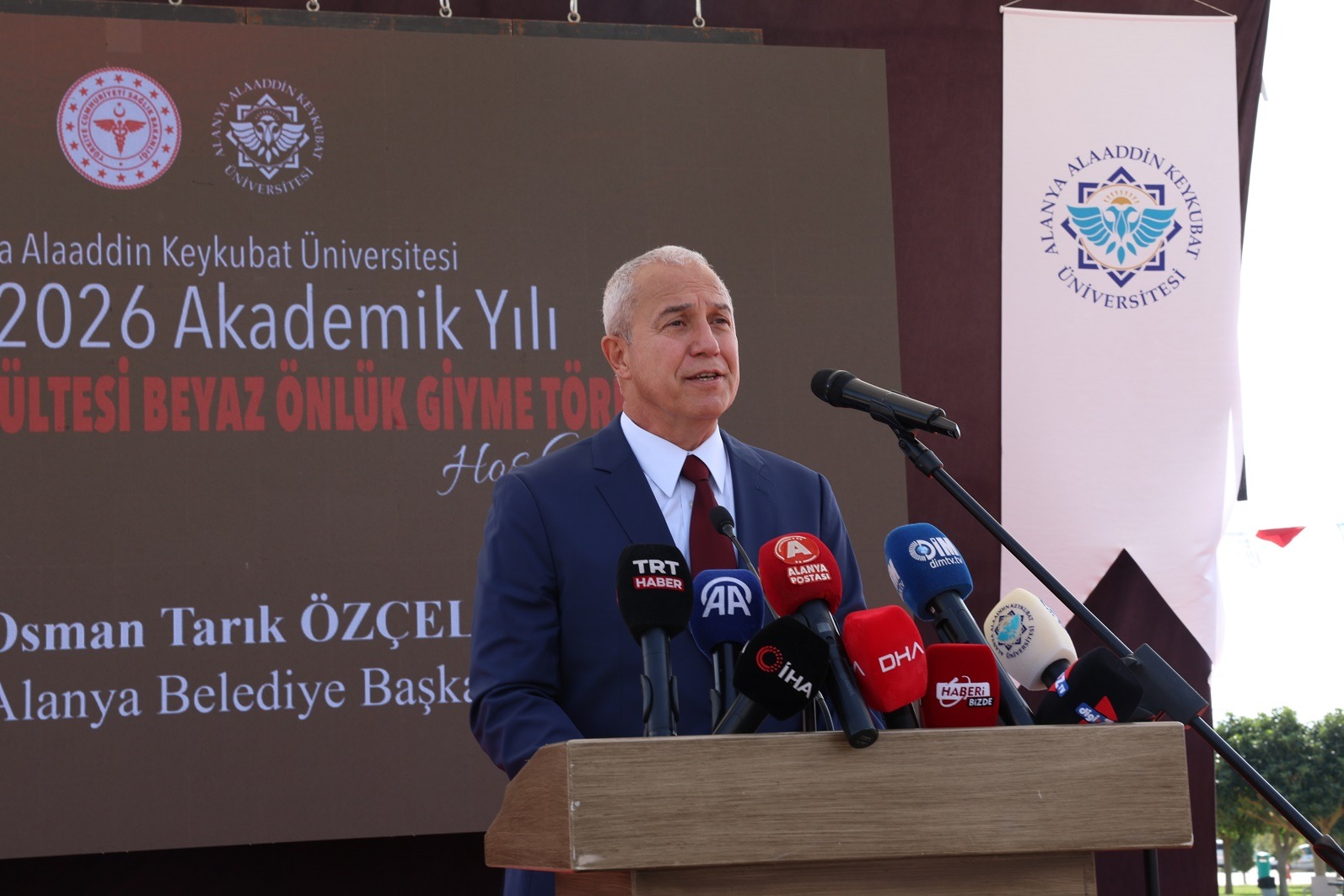 Alanya Alaaddin Keykubat Üniversitesi (ALKÜ) 2025-2026 Akademik Yılı Açılış Töreni, İlk Ders ve Tıp Fakültesi Beyaz Önlük Giyme Töreni, Sağlık Bakanı Prof. Dr. Kemal Memişoğlu’nun katılımıyla büyük bir coşkuyla gerçekleşti. Kestel Amfitiyatro alanında yapılan törene, Antalya Vali Vekili Salih Yüce, Antalya Milletvekili Tuba Vural Çokal, ALKÜ Rektörü Prof. Dr. Kenan Ahmet Türkdoğan, Alanya Kaymakamı Şakir Öner Öztürk, Alanya Belediye Başkanı Osman Tarık Özçelik, İl Sağlık Müdürü Prof. Dr. Behçet Özkan, STK ve siyasi parti temsilcileri, kurum ve kuruluş başkanları, hayırseverler, Alanya protokolü, akademik, idari personel, öğrenciler, aileleri ve vatandaşlar katıldı. Saygı duruşu ve İstiklal Marşı ile başlayan program, ALKÜ’nün 10’uncu yıl tanıtım filmi gösterimiyle devam etti.