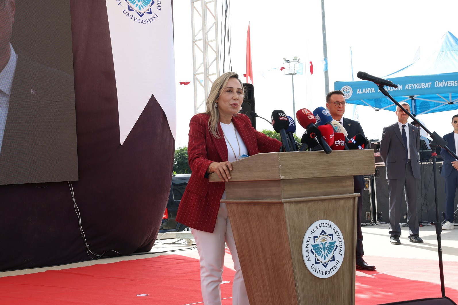 Programda konuşan Rektör Türkdoğan, Bakan Memişoğlu’na katılımları için teşekkür etti. Rektör Türkdoğan konuşmasının devamında, ALKÜ’nün 10 yıl gibi kısa zamanda hızlı büyüdüğünü ve geliştiğini belirterek emekleri geçen önceki dönem Dışişleri Bakanı Antalya Milletvekili Mevlüt Çavuşoğlu’na ilk hayırsever Kemal Reisoğlu’na, tüm hayırsever ve katkı veren Alanyalılara teşekkür etti. ALKÜ’nun onuncu yılında yeni akademik yılı karşılamanın heyecanını yaşadıklarını belirtti. Rektör Türkdoğan konuşmasının devamında, “Bugün bilimin, emeğin, üretimin ve hayallerin yeniden filizlendiği bir gündeyiz. On yıl önce temelleri atılan bu büyük aile, bugün Türkiye’nin yükselen yükseköğretim değerlerinden biri hâline gelmiştir. Üniversitemiz, geride bıraktığı on yıl içinde: Bilimsel yayın kapasitesini her yıl yükseltmiş, TÜBİTAK projelerinde, ulusal ve uluslararası araştırma fonlarında güçlü bir atılım göstermiş, TEKNOFEST ve TÜBİTAK yarışmalarında Türkiye dereceleri elde etmiş, genç bilim insanlarının yetiştiği, tecrübenin köklendiği bir iklim oluşturmuştur. Bu başarılar; inanan, çalışan, üreten akademisyenlerimizin, idari kadromuzun ve bu üniversiteyi evi bilen gençlerimizin eseridir. Dünyanın hızla değiştiği bu çağda, ALKÜ olarak sadece izleyen değil, yön veren bir üniversite olma iradesine sahibiz. Bugün artık; Sağlık bilimlerinden mühendisliğe, sosyal bilimlerden spor bilimlerine, turizmden teknolojiye uzanan güçlü bir akademik ekosistem kurduk. Ve biliyoruz ki insana yatırım, geleceğe yatırımdır. Akademik büyümemizi, fiziki yatırımlarımızla da destekliyoruz. Yeni fakülte binaları, modern laboratuvarlarımız, klinik ve araştırma altyapımız, spor ve sağlık tesislerimiz ile bölgesine değer katan, geleceğini planlayan bir üniversiteyiz.” dedi.