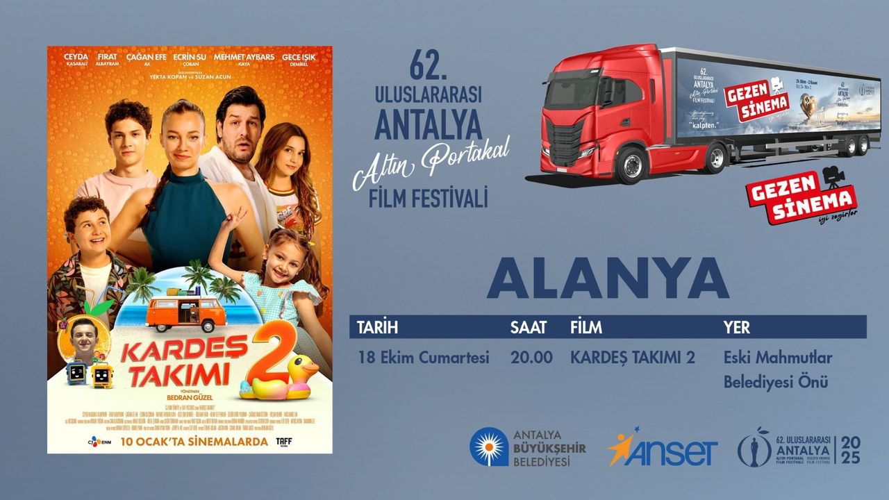 Türkiye’nin en köklü sinema etkinliği olan 62. Uluslararası Antalya Altın Portakal Film Festivali’nin sıcak atmosferi “Gezen Sinema” etkinliği kapsamında Alanya Mahmutlar Mahallesi Eski Belediye Binası önünde gösterim yapılacak. Yönetmenliğini Bedran Güzel’in yaptığı, 2025 yapımı Kardeş Takımı 2 Filmi’nde Ceyda Kasabalı, Fırat Albayram, Çağan Efe Ak, Ecrin Su Çoban, Mehmet Aybars Kaya ve Gece Işık Demirel rol alıyor. Saat 20:00’de başlayacak Kardeş Takımı 2 filmini izlemeye bütün vatandaşlarımız davetlidir.
