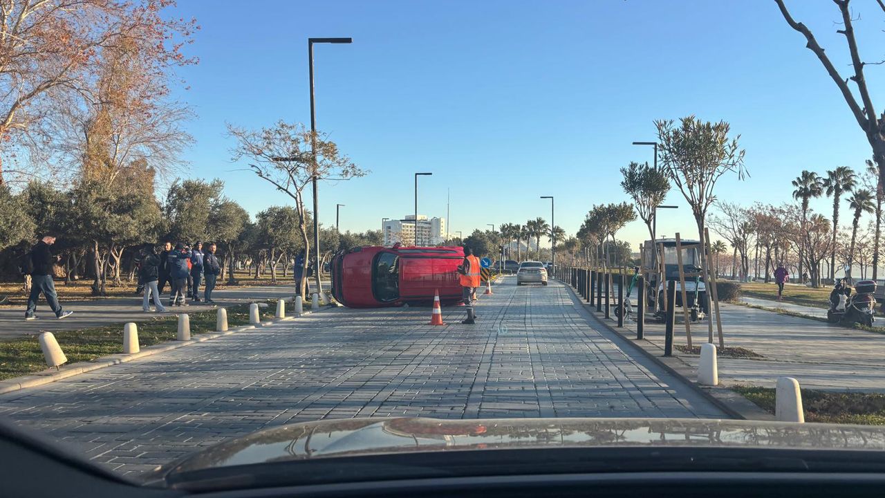 Antalya'da sahil boyunda yan yatan aracın sürücüsü, kazayı yara almadan atlattı.
