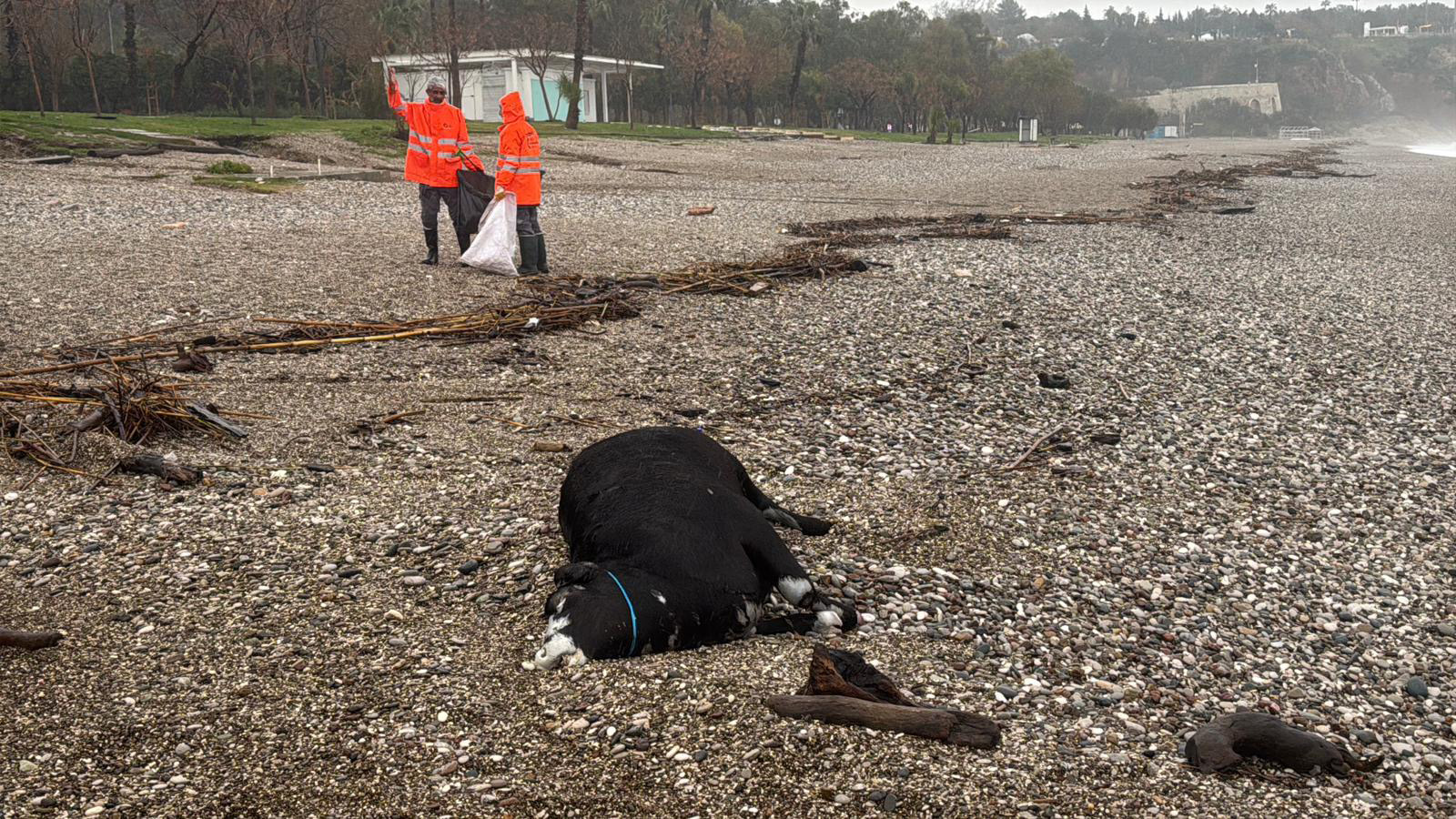 Antalya'nın dünyaca ünlü Konyaaltı Sahili'nde, sel ve fırtına ile beraber denize sürüklendiği değerlendirilen ölü boğa bulundu. Büyükşehir Belediyesi'ne bağlı kıyı temizliği yapan ekiplerin bulduğu dana, vinç ile bulunduğu yerden alındı. Antalya Kundu bölgesinde ise araziler su altında kaldı.
