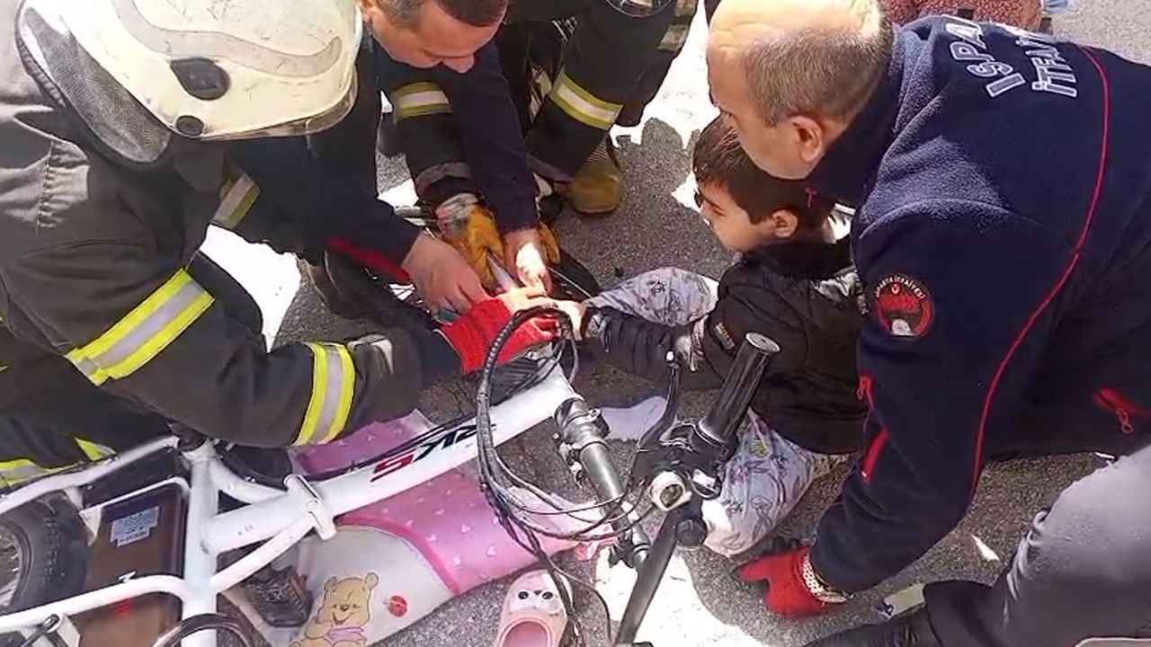 Isparta'da olay, Fatih Mahallesi 4628 sokakta meydana geldi. Metin A.'nın ayağı bindiği bisiklete sıkıştı. Çevredekilerin yardımına geldiği çocuk için Isparta Belediyesi İtfaiye Müdürlüğü ekiplerine haber verildi. Olay yerine gelen ekipler müdahale ederek Metin A.'yı kurtardı. Metin A.'nın sağlık durumunun iyi olduğu öğrenildi.