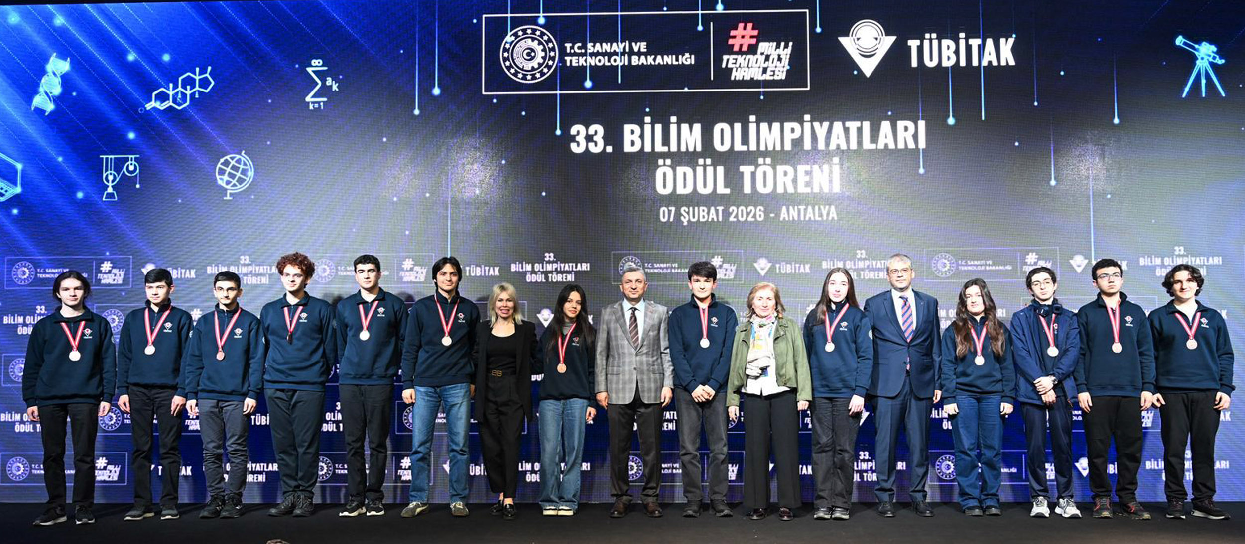 Ulusal ve uluslararası bilim olimpiyatlarında başarı elde eden öğrencilerin ödüllendirildiği '33. Bilim Olimpiyatları Ödül Töreni', Antalya'da gerçekleştirildi. Törende, 2025 yılı bilim olimpiyatlarında dereceye giren; 38 altın, 77 gümüş ve 110 bronz madalya kazanan toplam 225 öğrenciye ödülleri, Antalya Valisi Hulusi Şahin ve protokol üyeleri tarafından takdim edildi.