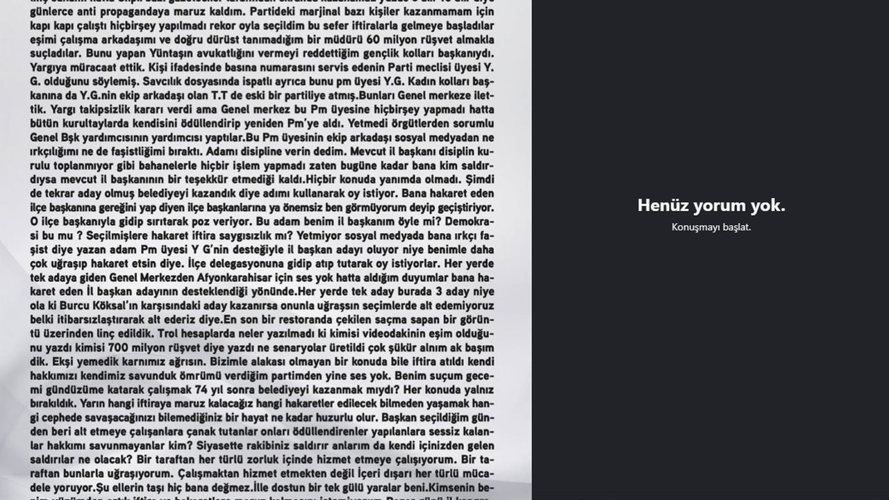 Afyonkarahisar Belediye Başkanı Burcu Köksal, AK Parti'ye katılacağı yönündeki iddialara ilişkin sosyal medya hesabından açıklama yaptı. Burcu Köksal, "Bulunduğum yerdeyim, parti içinde beni istemeyenlere inat hiçbir yere gitmiyorum. Yıllardır iftiraları çürüte çürüte, yalanları yıka yıka mücadeleme devam ediyorum. 37. Kurultay'dan beri huzurlu bir günüm olmadı. Yemediğim hakaret kalmadı. Dışarıdan saldıranları anlarım siyasette ama ömrümü verdiğim partimden gelenlere ne diyeceğim? Memleketime belediye başkan adayı oldum. Hizmeti buradan sürdüreyim diye. Adaylığım sürecinde partimden kovuldum, linç edildim hatta CHP'li bazı gazeteciler tarafından ekranda 'Kazanamaz, yüzde 5 alır, 10 alır' diye günlerce anti propagandaya maruz kaldım. Partideki marjinal bazı kişiler kazanmamam için kapı kapı çalıştı, hiçbir şey yapılmadı, rekor oyla seçildim. Bu sefer iftiralarla gelmeye başladılar. Eşimi, çalışma arkadaşımı ve doğru dürüst tanımadığım bir müdürü 60 milyon rüşvet almakla suçladılar" ifadelerini kullandı.