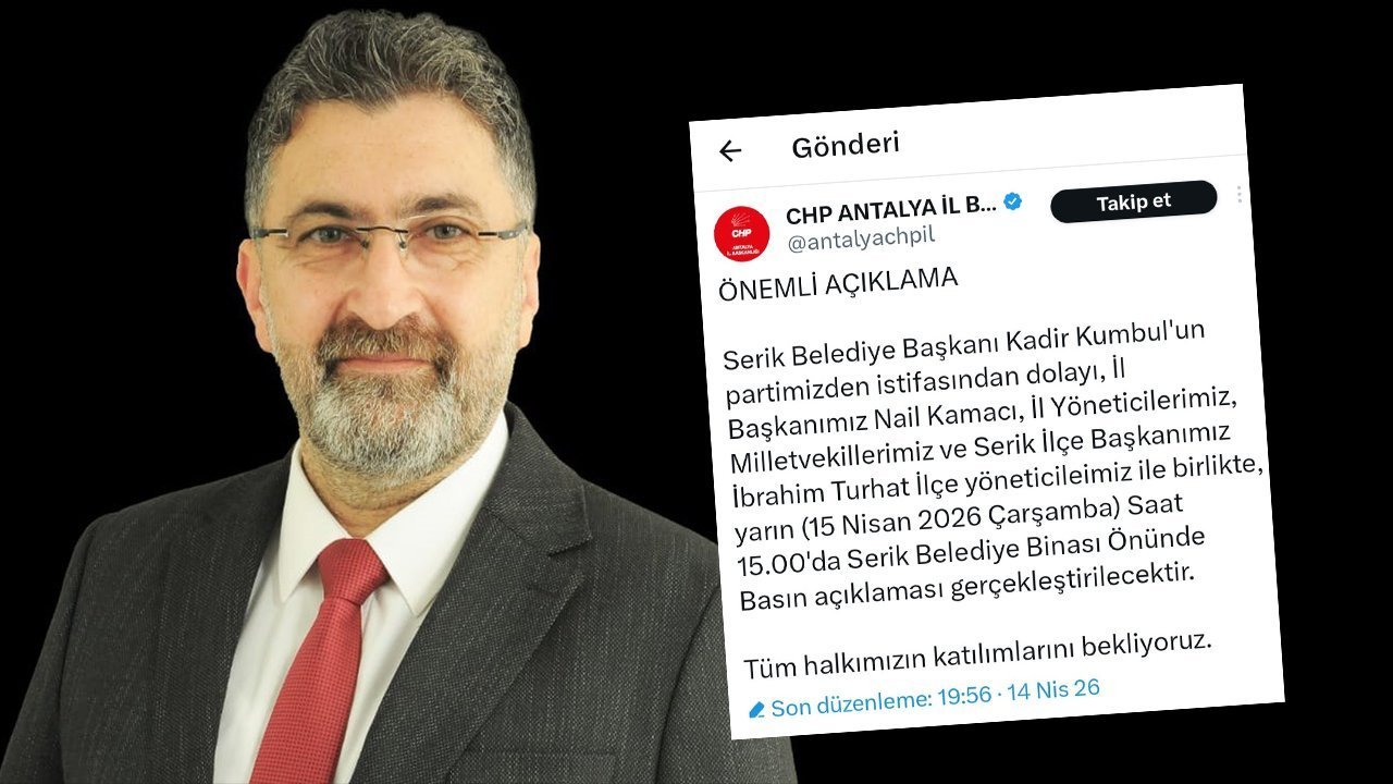 Cumhuriyet Halk Partisi (CHP) Antalya İl Başkanlığı, Serik Belediye Başkanı Kadir Kumbul'un partilerinden istifa ettiğini duyurdu.