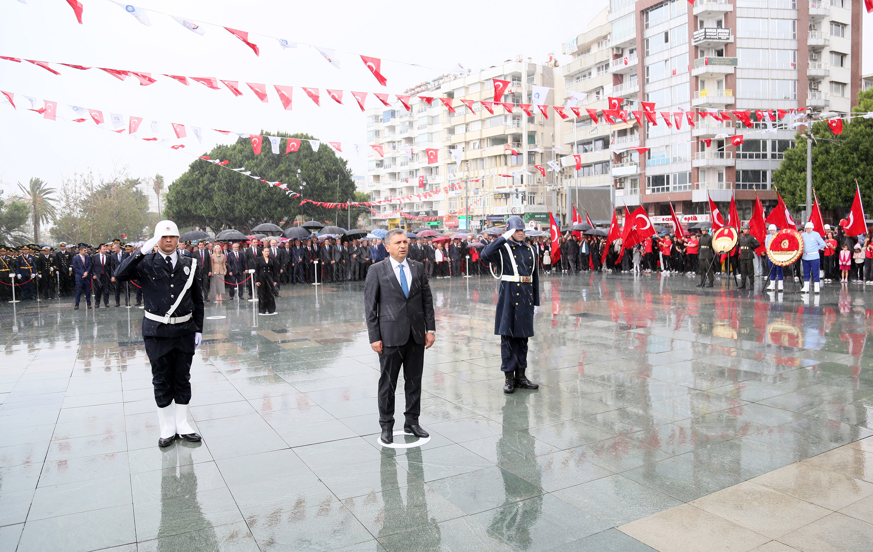 Öğrencilerin Türk bayraklarıyla süslediği meydanda, askeri bando eşliğinde çeşitli marşlar seslendirildi. Vali Şahin, Garnizon Komutanı Eren ve Büyükşehir Başkan Vekili Özdemir'in Atatürk Anıtı'na çelenk sunumunun ardından da saygı duruşunda bulunuldu ve İstiklal Marşı okundu. Tören sırasında yoğun sağanak görülürken, hem protokol hem de vatandaşlar yağıştan etkilendi. Tören boyunca yoğun yağışa rağmen ön taraftaki protokol üyeleri şemsiye kullanmazken, arkada bulunanlardan bazıları ise şemsiyeyle korunmaya çalıştı. Siyasi partiler ve sivil toplum örgütleri de anıta çelenk sunumu gerçekleştirdi.