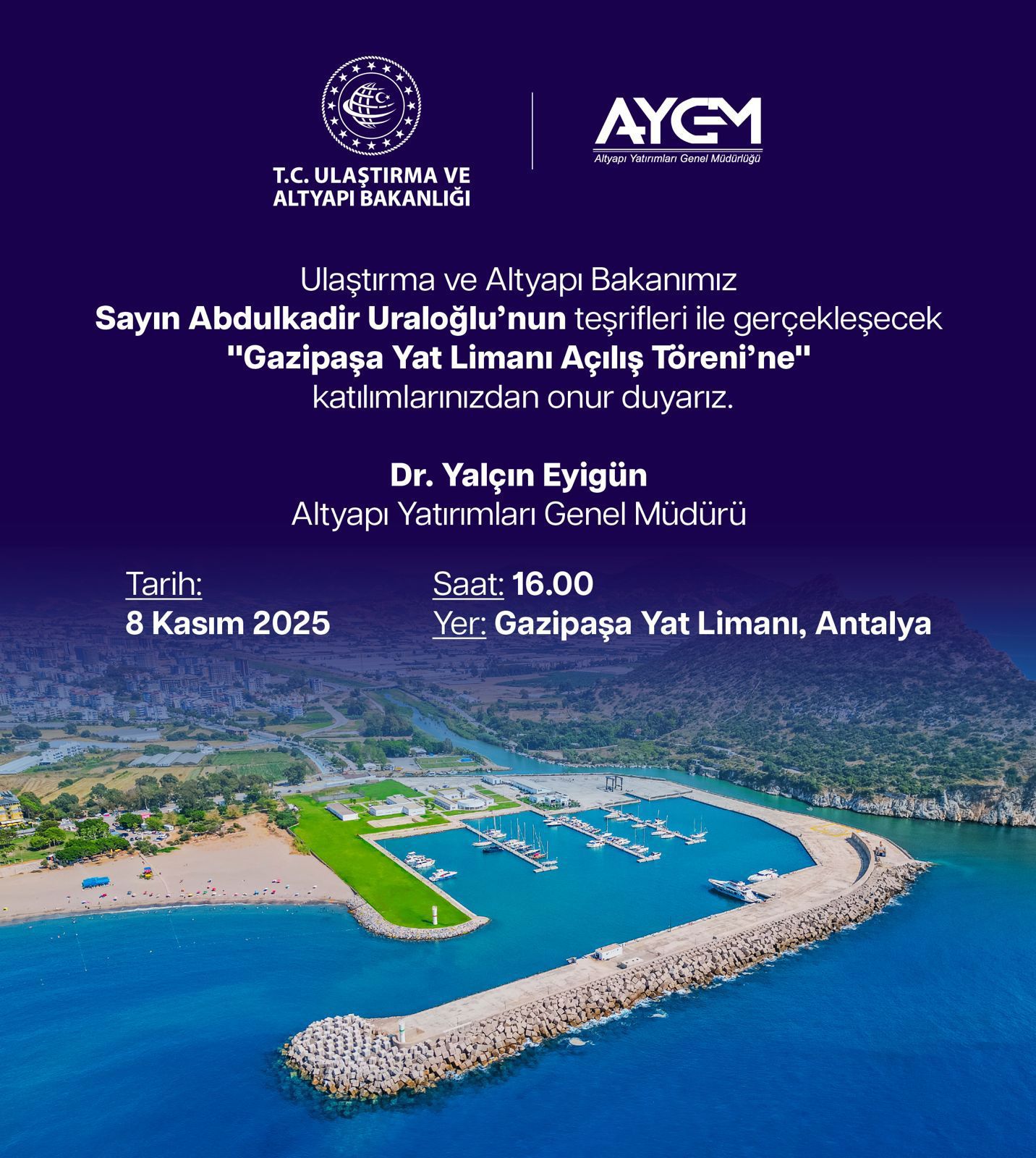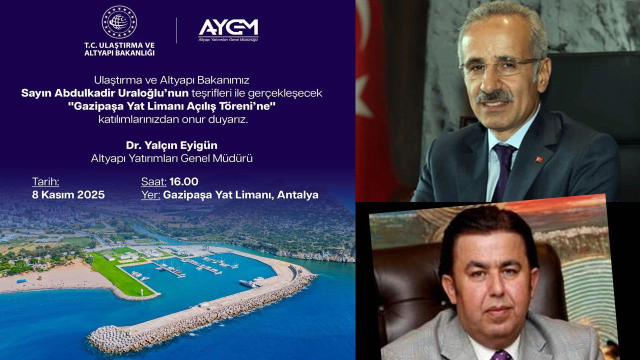 Gazipaşa Yat Limanı, 8 Kasım Cuma günü saat 16.00’da gerçekleştirilecek görkemli bir törenle hizmete girecek. Açılışa Ulaştırma ve Altyapı Bakanı Abdulkadir Uraloğlu’nun yanı sıra bölge protokolü ve vatandaşlar katılacak. Tören, ilçenin denizcilik alanındaki dönüşümünü simgeleyen tarihi bir an olarak kayıtlara geçecek.