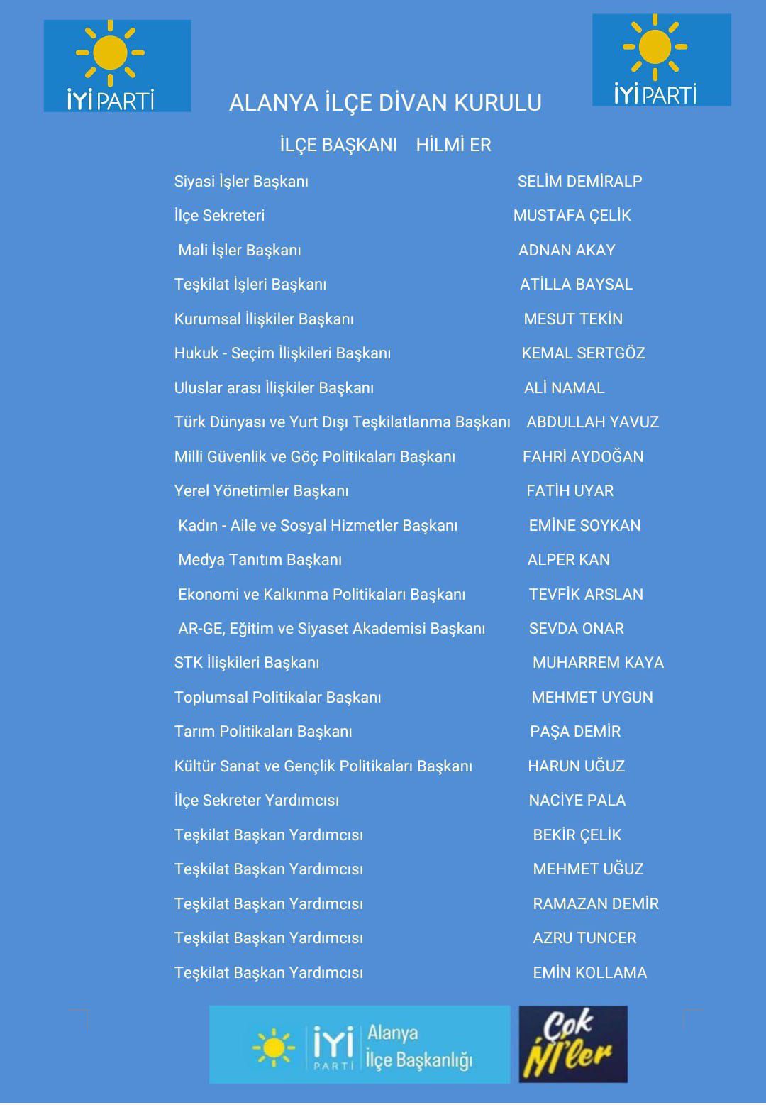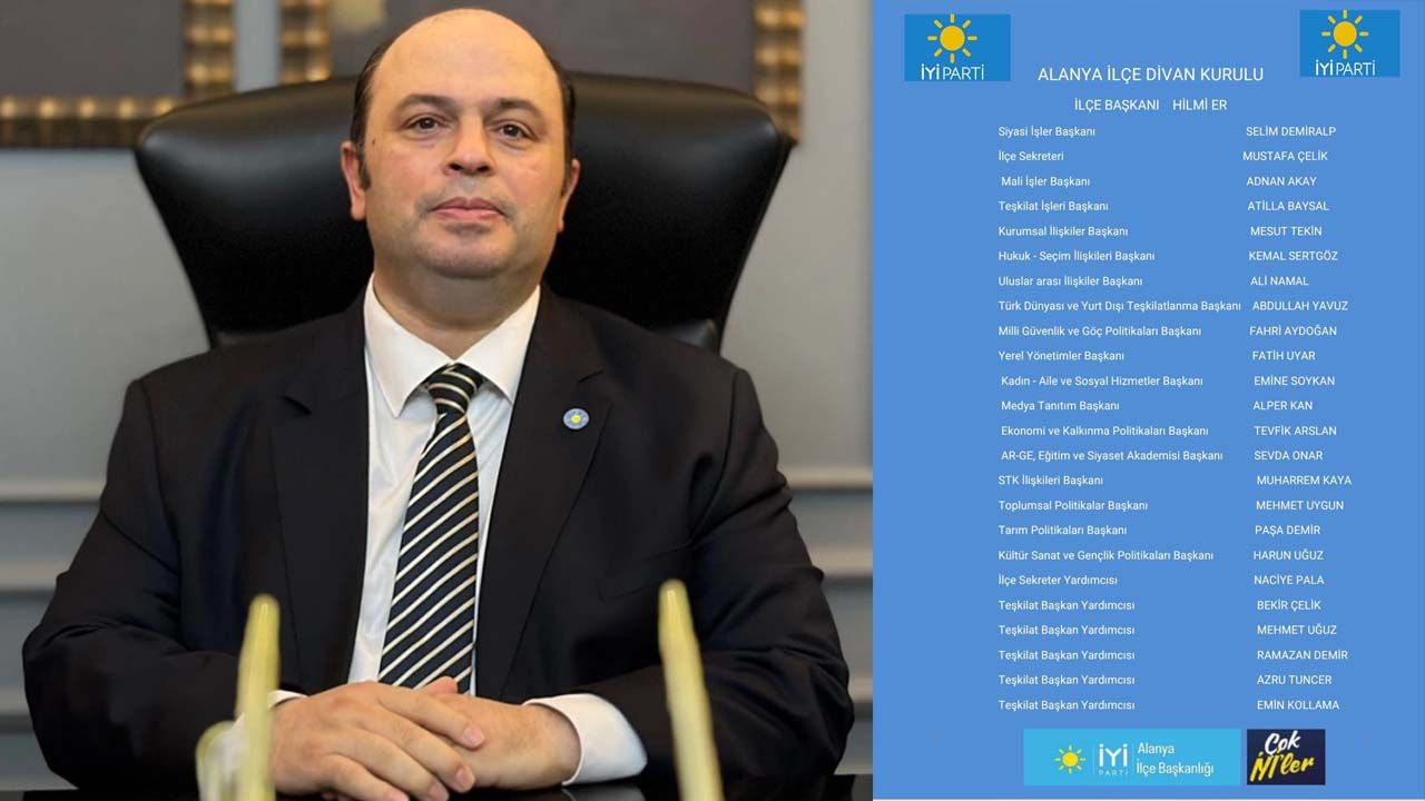 İYİ Parti Alanya İlçe Başkanlığı, 4 Ekim 2025 tarihinde gerçekleştirilen ilçe kongresinin ardından divan kurulunu yeniledi. İlçe Başkanı Hilmi Er, belirlenen yeni yönetimi açıklayarak, "Kongremizin ardından oluşturduğumuz divan kurulumuzla Alanya'mıza, Antalya'mıza ve partimize hayırlı olsun. Kararlı çalışmalarımıza hız kesmeden devam edeceğiz" ifadelerini kullandı.