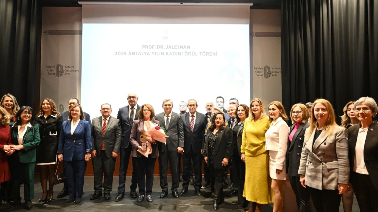 Türkiye'nin ilk kadın arkeoloğu olan Prof. Dr. Jale İnan adına düzenlenen Profesör Doktor Jale İnan 2025 Antalya Yılın Kadını Ödül Töreni, Antalya Kültür Sanat Oditoryumu’nda gerçekleştirildi. Antalya Tanıtım Vakfı (ATAV) ve Antalya Kadın Müzesi iş birliğiyle bu yıl 10’uncusu düzenlenen törene; Vali Hulusi Şahin, Muratpaşa Kaymakamı İhsan Kara, ATSO Başkanı Yusuf Hacısüleyman, ATAV Yönetim Kurulu Başkanı Emir Gündal ve Yılın Kadını adayları katıldı.