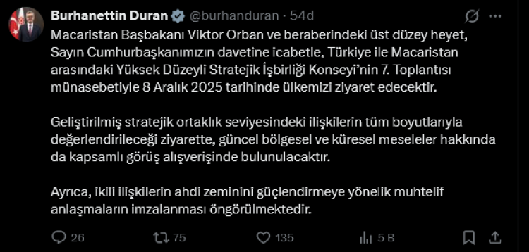 İletişim Başkanı Burhanettin Duran, Macaristan Başbakanı Viktor Orban'ın Cumhurbaşkanı Recep Tayyip Erdoğan'ın daveti üzerine 8 Aralık Pazartesi günü Türkiye'yi ziyaret edeceğini duyurdu. Orban'a, Macaristan hükümetinden üst düzey bir heyet de eşlik edecek.