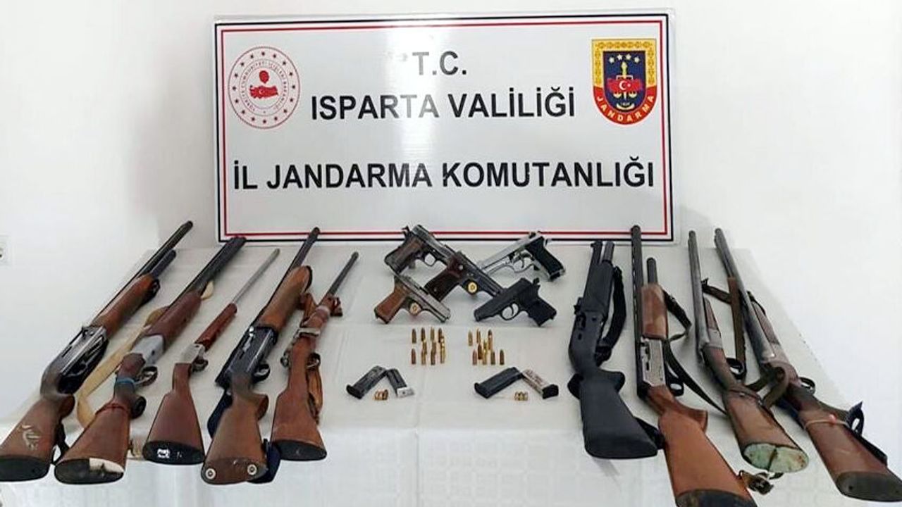 Isparta'da jandarma ekipleri Bağacık köyünde M.G., A.B., İ.D., M.E. ve M.E.'nin ikametlerinde ruhsatsız tabanca ve av tüfeği bulundurdukları bilgisine ulaştı. Cumhuriyet Başsavcılığı'ndan alınan izin doğrultusunda şüphelilerin adreslerinde adli arama gerçekleştirildi. Yapılan aramalarda 9 milimetre çapında 2 ruhsatsız tabanca, 7.65 milimetre çapında ruhsatsız tabanca, 2 ruhsatsız kurusıkı tabanca, 9 milimetre çapında 24 tabanca fişeği, 7.65 milimetre çapında 5 tabanca fişeği, tabancalara ait 4 şarjör, 9 av tüfeği ve 32 av tüfeği fişeği ele geçirildi. Operasyon kapsamında 5 şüpheli yakalanarak gözaltına alındı. Olayla ilgili işlemlerin sürdüğü bildirildi.
