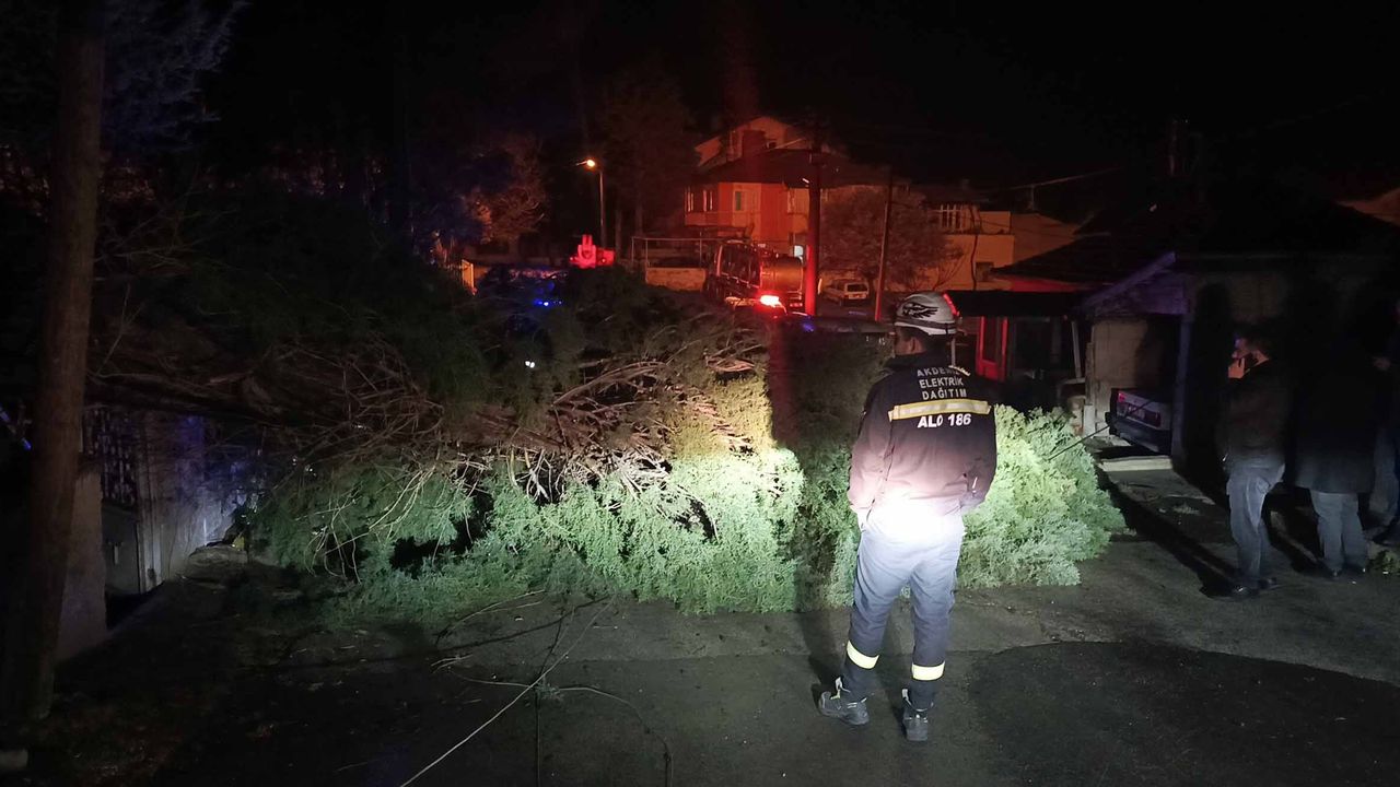 Şiddetli rüzgar nedeniyle evin bahçesindeki çam ağacı yola devrildi. Olayda elektrik telleri koparken, bir hafif ticari araç da zarar gördü.