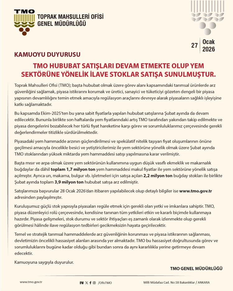 Toprak Mahsulleri Ofisi (TMO), hububat piyasasında arz güvenliğini sağlamak ve fiyat istikrarını korumak amacıyla regülasyon çalışmalarını sürdürüyor. TMO tarafından yapılan açıklamada, Ekim 2025'ten bu yana sabit fiyatlarla sürdürülen hububat satışlarına Şubat ayında da devam edileceği bildirildi. Son haftalarda yem fiyatlarında yaşanan artışın yakından takip edildiği belirtilen açıklamada, besici ve yetiştiriciler ile yem sektörüne yönelik olarak TMO stoklarından yüksek miktarda yem hammaddesi satışı yapılmasına karar verildiği ifade edildi. Bu kapsamda; başta mısır ve arpa olmak üzere, yem sektöründe kullanılabilecek düşük vasıflı buğdayların da dâhil olduğu 1,7 milyon ton yem hammaddesi makul fiyatlarla satışa açıldı. Ayrıca un, makarna ve bulgur sanayisine yönelik 2,2 milyon ton buğday ile birlikte Şubat ayında toplam 3,9 milyon ton hububat piyasaya sunulmuş oldu. Satışlara ilişkin başvuruların 28 Ocak 2026 tarihinden itibaren alınacağı belirtilirken, detaylı bilgilere www.tmo.gov.tr adresinden ulaşılabileceği kaydedildi.