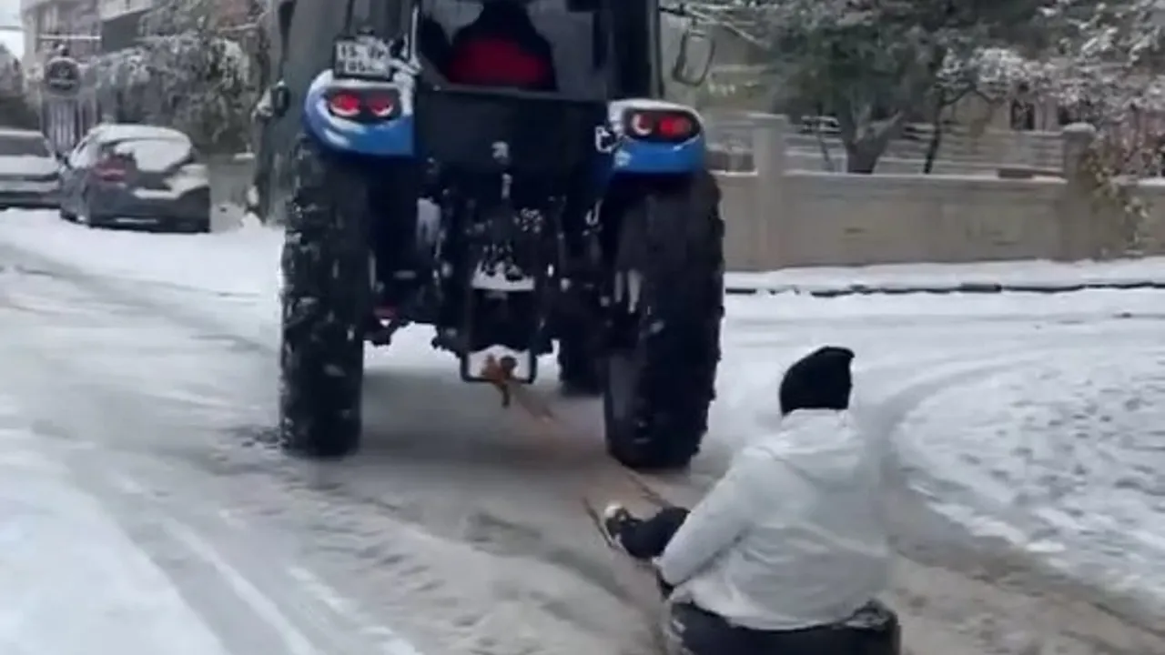 Adıyaman'da etkili olan kar yağışıyla birlikte ortaya çıkan görüntüler izleyenleri gülümsetti. Kar keyfini farklı bir şekilde yaşamak isteyen bazı vatandaşlar, traktörün arkasına bağladıkları halata tutunarak karlı yolda metrelerce kaydı.