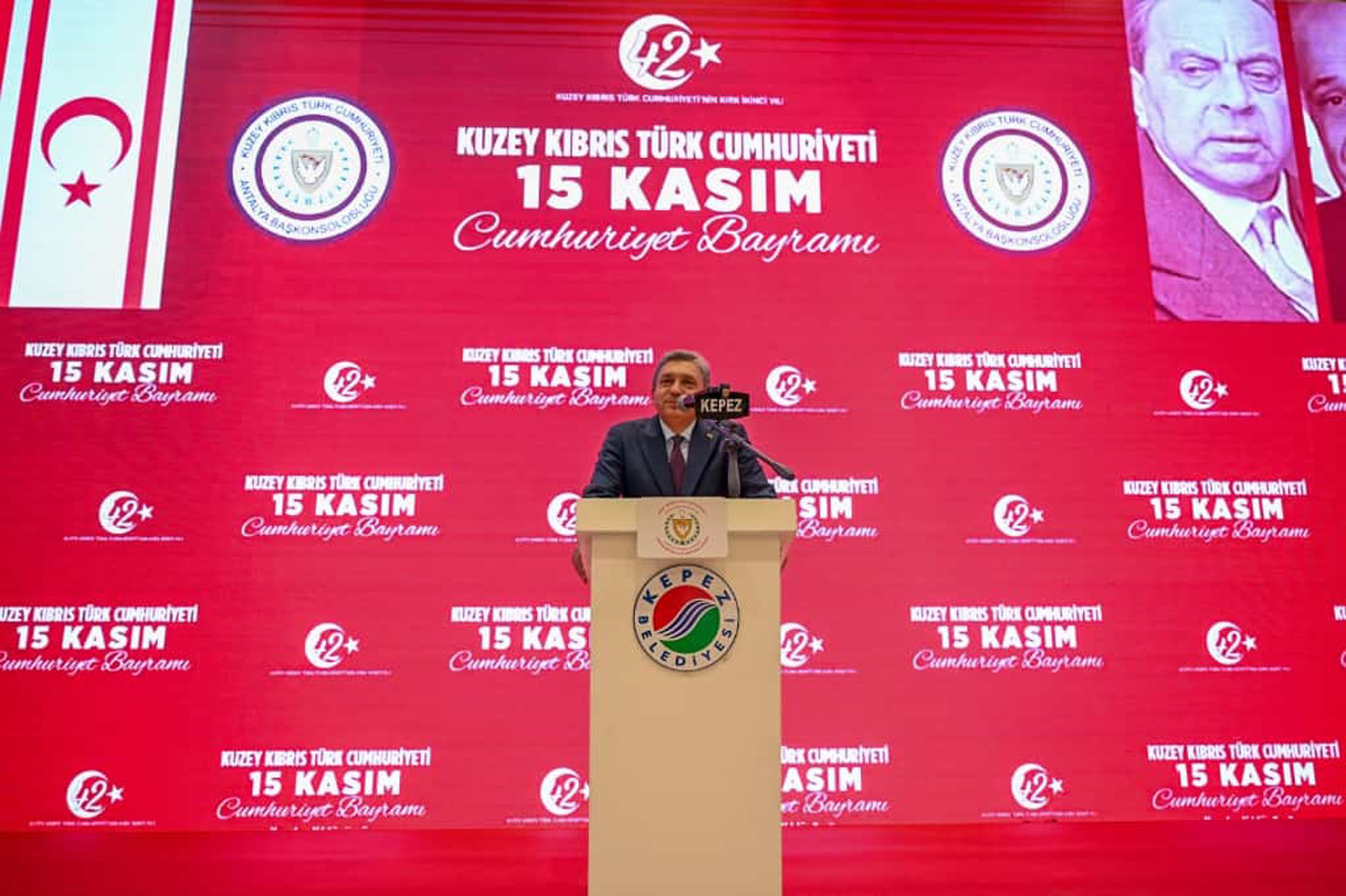 KKTC'nin 42'nci kuruluş yıl dönümü dolayısıyla, KKTC Antalya Başkonsolosu Aslı Erkmen'in ev sahipliğinde Mimar Sinan Kongre Merkezi'nde 15 Kasım Cumhuriyet Bayramı Resepsiyonu düzenlendi. Resepsiyona Antalya Valisi Hulusi Şahin ve eşi Ebru Şahin, Isparta Valisi Abdullah Erin, Vali Yardımcısı Tahsin Aksu, Kepez Kaymakamı Suat Dervişoğlu, Döşemealtı Kaymakamı Ünal Çakıcı, Kepez Belediye Başkanı Mesut Kocagöz, KKTC Antalya Başkonsolosu Aslı Erkmen, İl Jandarma Komutanı Tümgeneral Ahmet Kavukcu, İl Emniyet Müdür Vekili Murat Baz, kurum ve kuruluş temsilcileri, STK temsilcileri, gaziler ve şehit aileleri katıldı.