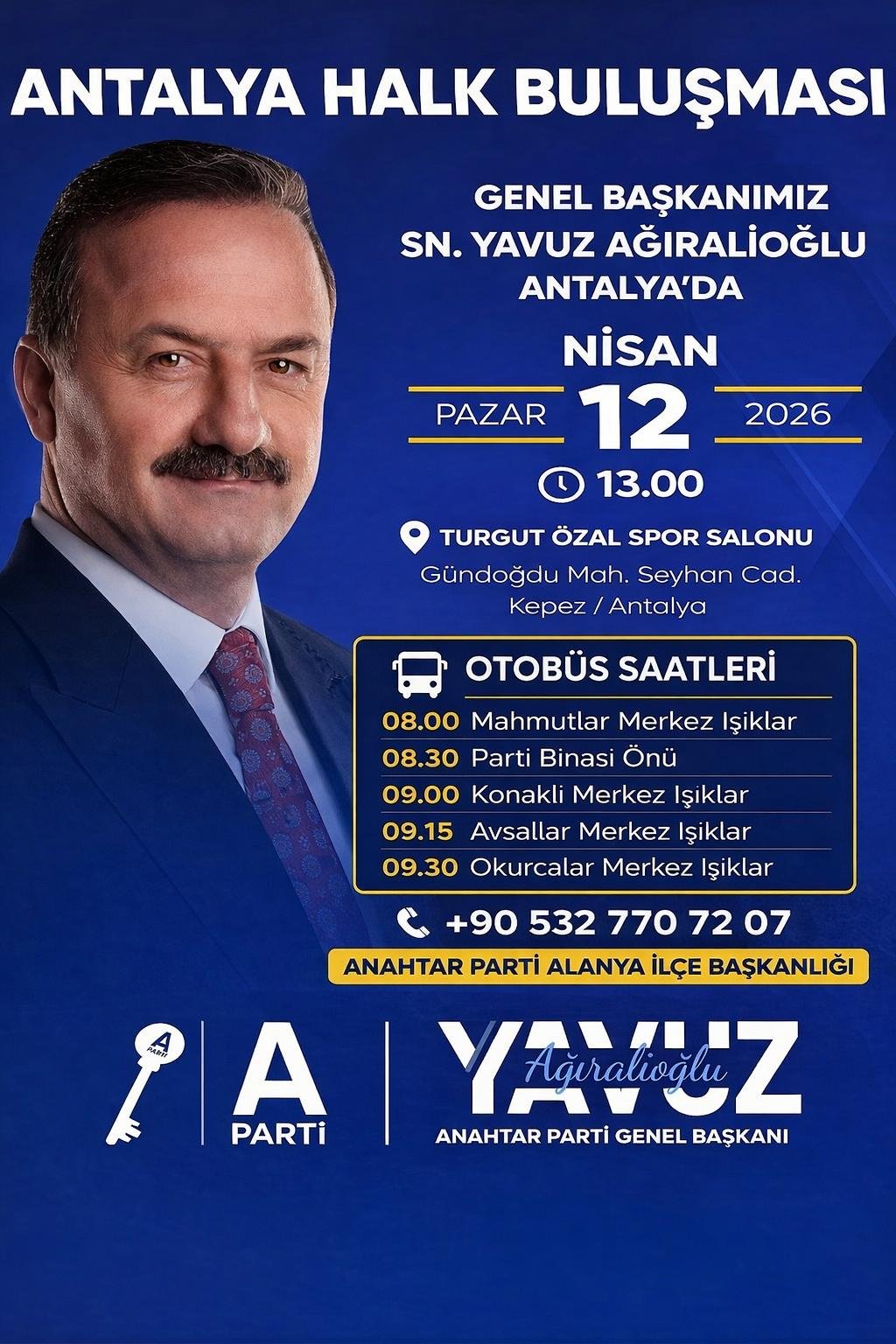 Anahtar Partisi Alanya İlçe Başkanı Abdullah Akkuş, vatandaşları 12 Nisan Pazar günü saat 13.00’te Kepez Turgut Özal Spor Salonu’nda düzenlenecek mitinge davet ederek, Genel Başkan Yavuz Ağıralioğlu’nun hitaplarını dinlemeye çağırdı.
